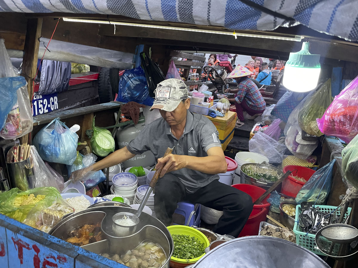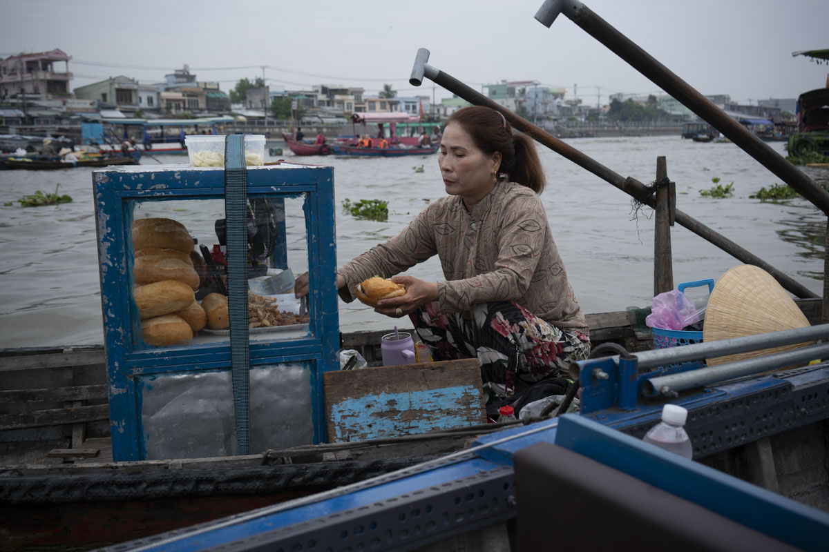 Auf dem schwimmenden Markt wurde alles mögliche verkauft, vom Boot links hatten wir unseren Kaffee, das Boot rechts machte Sandwich, Bánh mì.