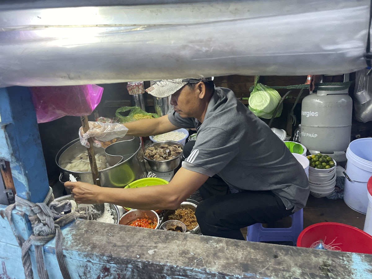 Auf dem Markt gegen 6:00 Uhr angekommen, gab es reltaiv bald eine Nudelsuppe, auch, da die Zeit bis es heller wurde, abgewartet werden musste. Es gab zahlreiche Boote, die Kaffee oder eben auch Suppe angeboten haben. Wie immer wird diese Suppe aus einzelteilen zusammengefügt: die Grundsuppe mit Fleisch (pork or beef), Sojasprossen, Basilikum, Chilli, Qumquad anstatt Limette, natürlich unterschiedliche Nudeln. All das wird in die Bowl gegeben und dann den (zumeist) Touristen überreicht.