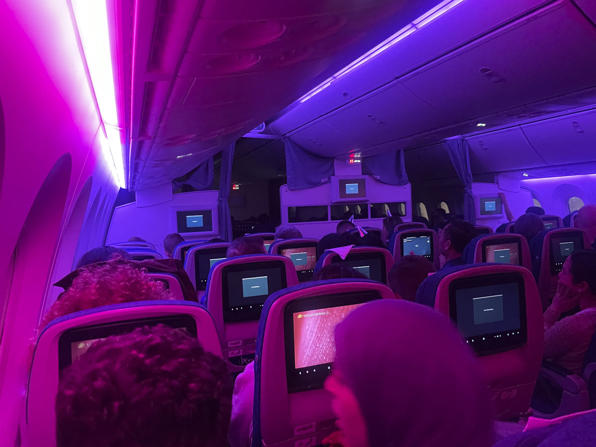 Aber beginne ich bei den Feuerwerken, die ich aus der Luft alle nicht sehen konnte, dem Vietnamesischen Flugpersonal, dass uns hat schlafen lassen, nach der Landung aber zu grosser Tat schritt: durch die knisternde Anlage des doch schon etwas verschlissenen Fliegers kratzte ABBA mit „happy new year“, dazu eine aufregende Lichtinszenierung, von der ich unten ein Foto beilege. Im Flughafen verlief alles problemlos, trotz aufgesetzter Neujahrsperformance in quietschig bunten Farben.