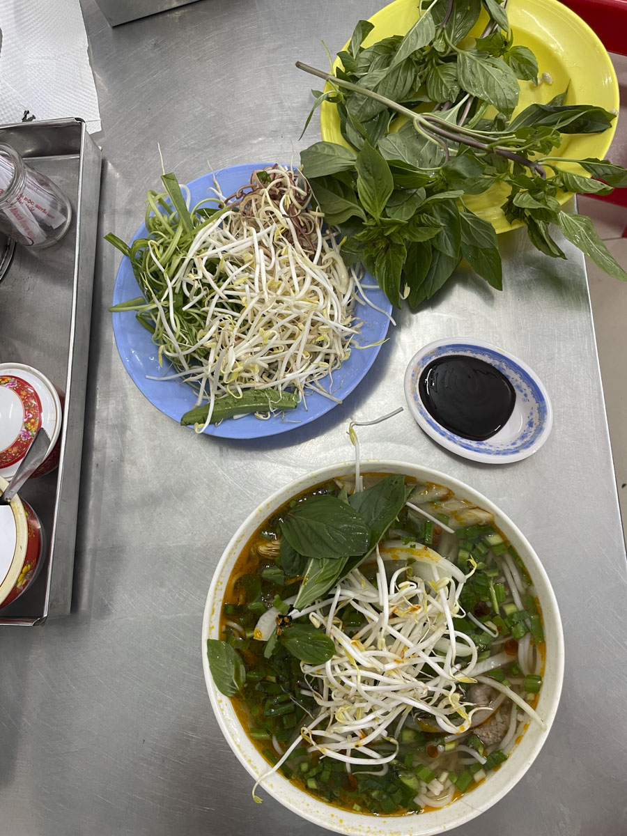 bislang habe ich immer an edelstahl-tischen gegessen, für uns ungewöhnlich. leider geht das suppe-essen auch nicht ohne plempern … auch bei den vietnamesen nicht, natürlich mit stäbchen und löffel und dem typischen grünen tee, den man immer gereicht bekommt, zum frühstück mit eis, beim kaffee heiss. gestern konnte ich sehen, wie sich mancher den tee mit ihrem kaffee-auf-eis gemischt hat, einfach dazugeschüttet – geht auch. beim essen gibt es viele saussen, von (vermutlich) soja- und fischsauce zu chilli-öl, limette und anderem, für jeden jecken ist etwas dabei. netterweise wird mir oft empfohlen, was gut schmeckt, was ich dann auch so empfinde. gegen das kleckern helfende papiertücher werden oft unter den tisch geworfen.