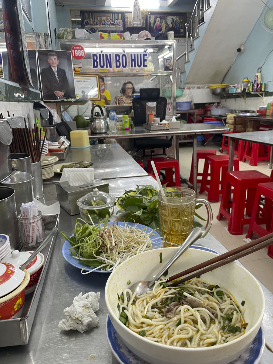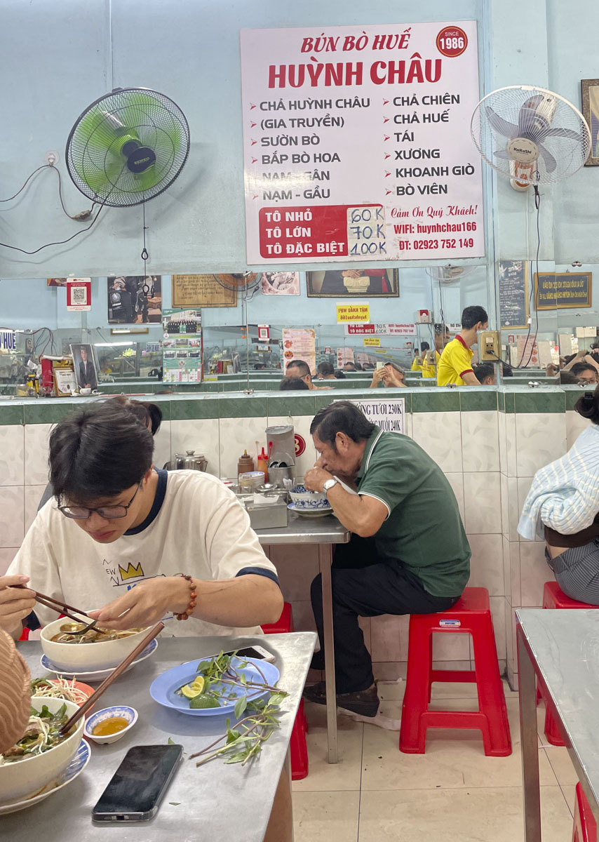 in diesen läden sitzt man übrigens in gleissendem neonlicht, romantik weit entfernt. die vietnamesen essen aber auch besonders schnell, gehen direkt nach fertig-essen, was selten aufgegessen meint. diese schnelligkeit ist beeindruckend, ebenso das licht, jedes studio-fotorgaf:innen-herz schlägt hier höher, alles gleichmässig ausgeleuchtet!