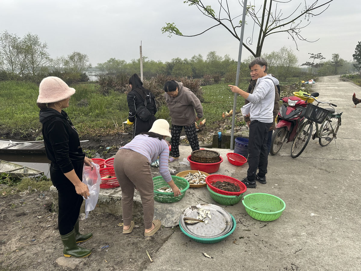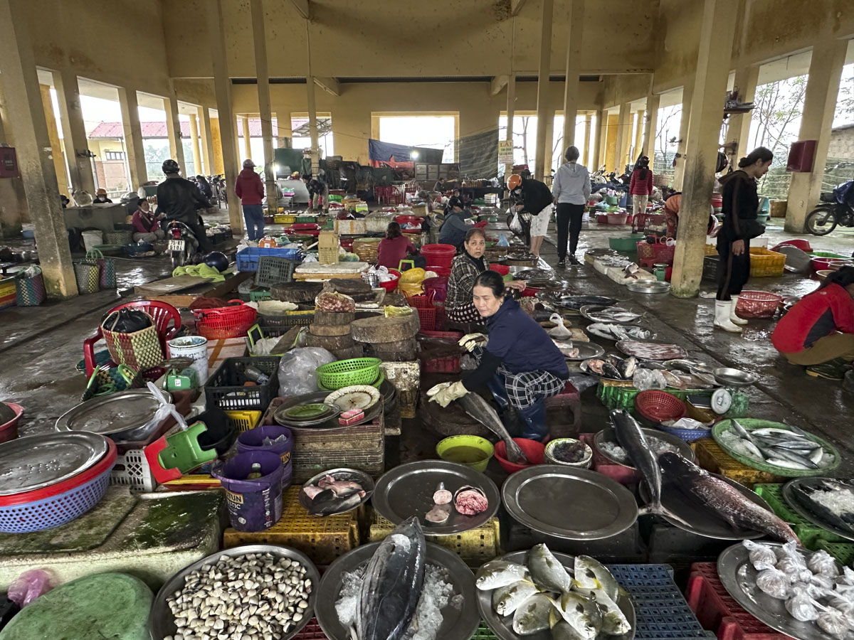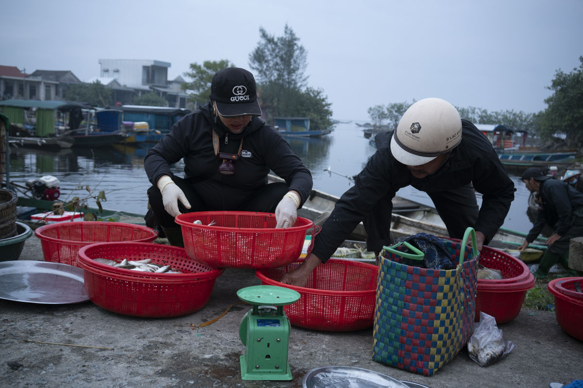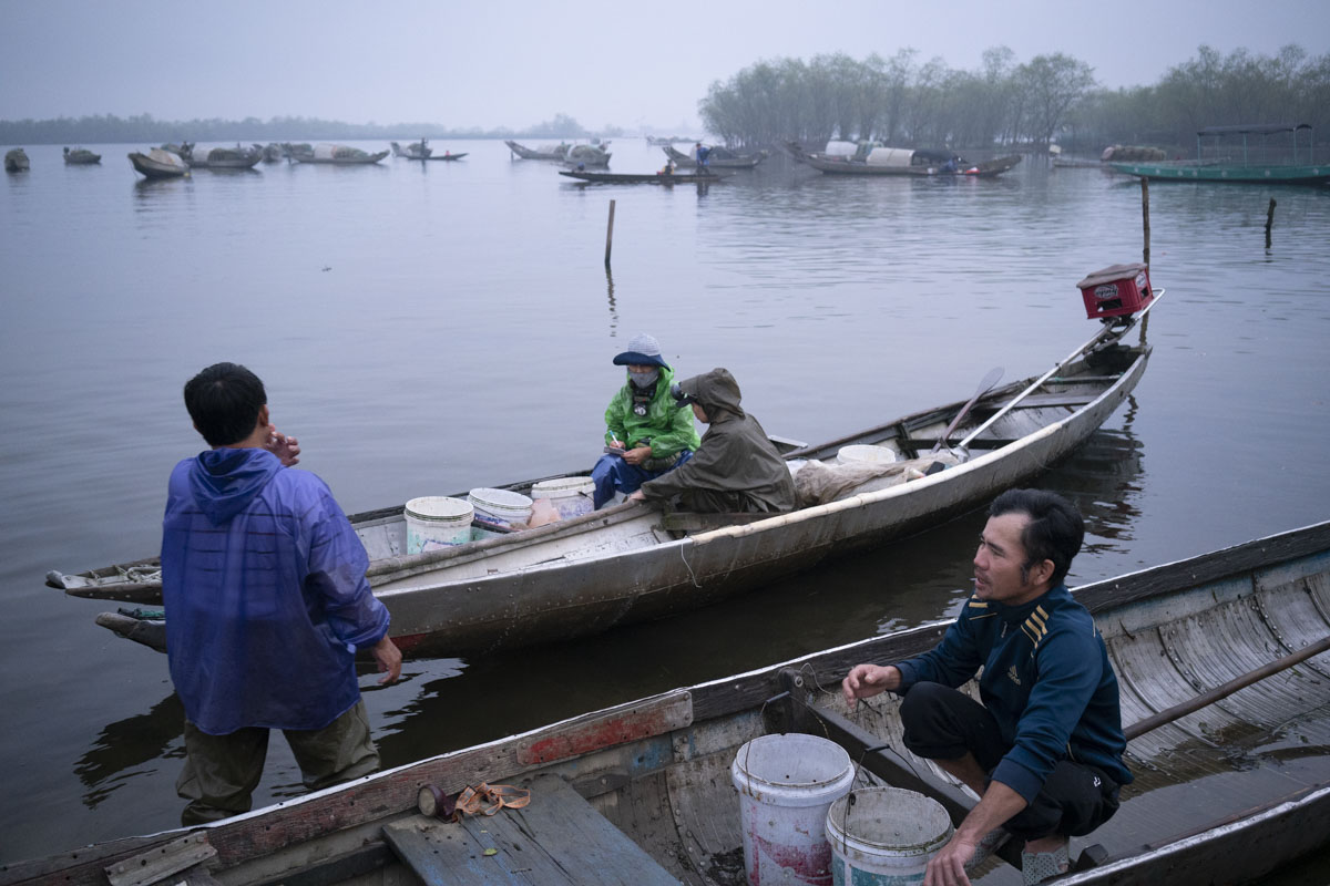 Fotografisch habe ich in den letzten zwei Tagen noch einmal alles hochfahren können, auf dem kleinen städtischen Markt gestern und heute früh ging es auf Verdacht an den grössten Binnensee in Vietnam, zur Lagune Tam Giang. 4:30 Uhr aufstehen, 1 Stunde Fahrzeit mit dem Taxi und dann das Zurechtfinden vor Ort. Einige wenige Fischer standen an Land, schauten den Booten zu, die peu à peu vom Fischen zurückkamen. Khanh, der Guide, übersetzte meine an die älteren Männer gestellten Fragen, in etwa so: „wievieel Boote kommen noch zurückgefahren?“ – “ „Viele.“ – „Wann kommen sie zurück?“ – „Bald.“ Nachdem die Fischer ausgeladen haben, fuhren sie zum Markt. „Wie weit ist der Markt entfernt?“ – „Nicht sehr weit.“ – „It´s quiet far?“ – „Not to far.“
